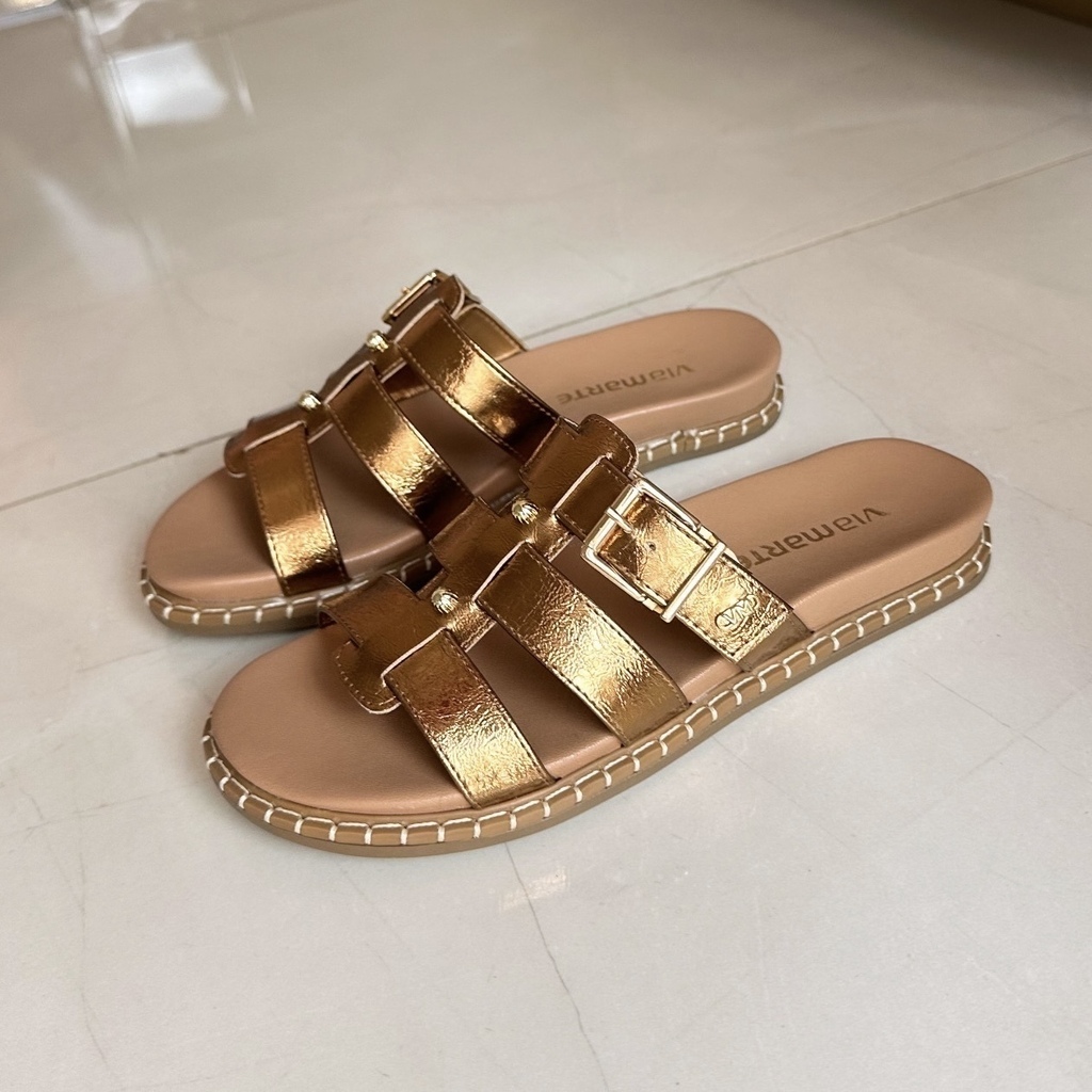 Complete seu look com a papete Via Marte na cor bronze, que combina conforto e estilo em um design prático. Com tira regulável para ajuste perfeito e detalhes em costuras no solado, essa papete é ideal para quem busca um calçado prático e moderno. Adquira a papete Via Marte e aproveite a fusão entre funcionalidade e elegância em seus dias.